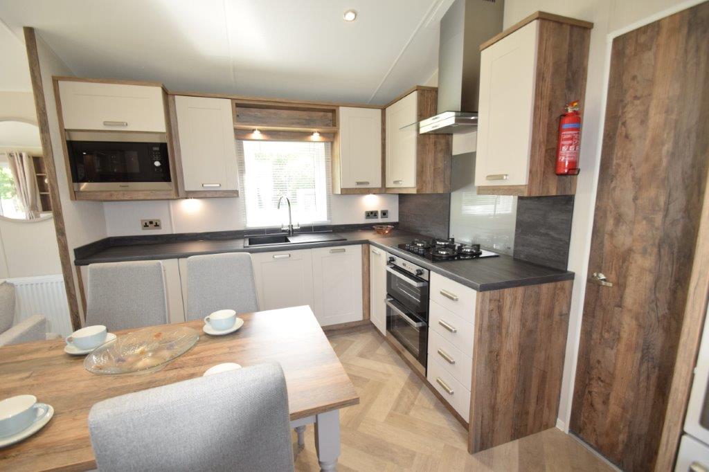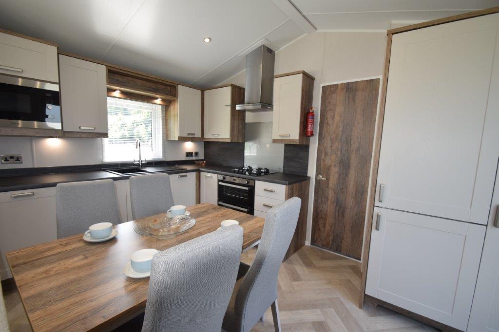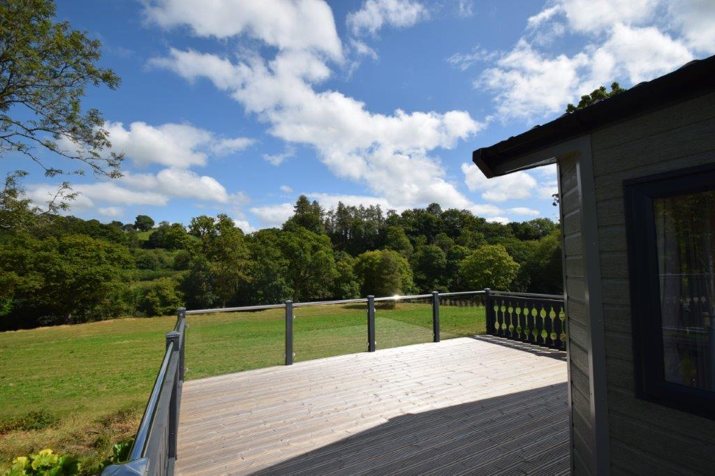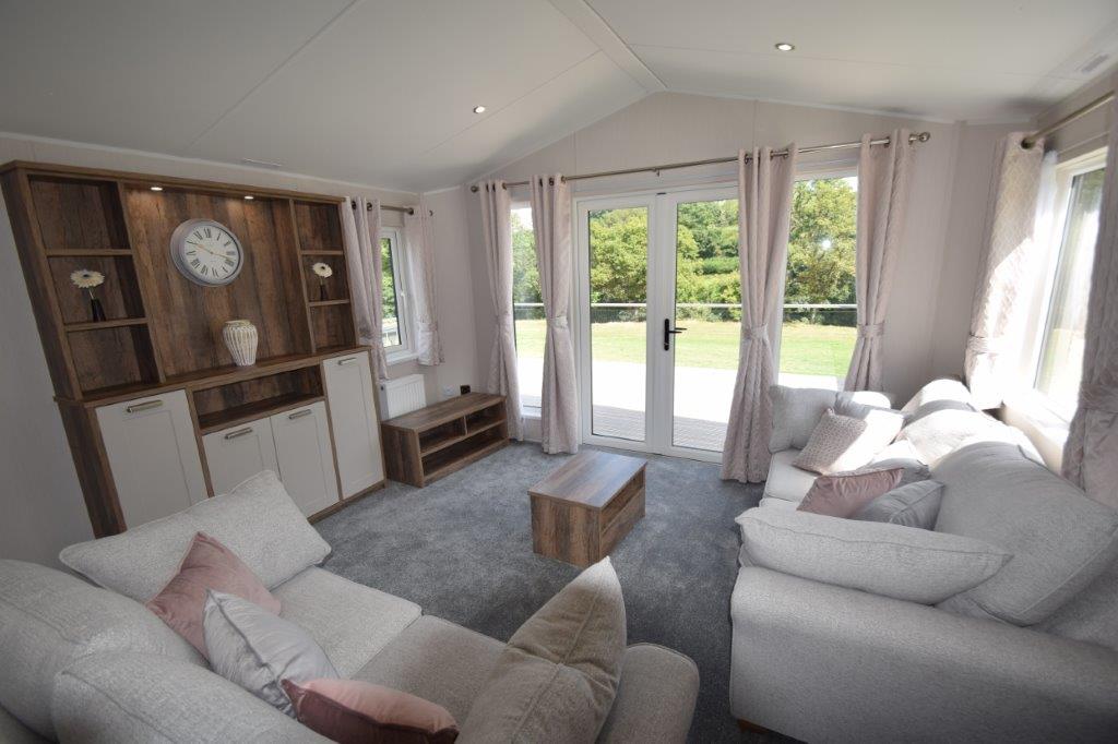 The lounge area is extremely comfortable with 2 good sized sofas (one incorporating a sofa bed), a coffee table, TV unit and feature storage. The French doors open out on the the decking with great views over the wild flower meadow and the river Banwy.